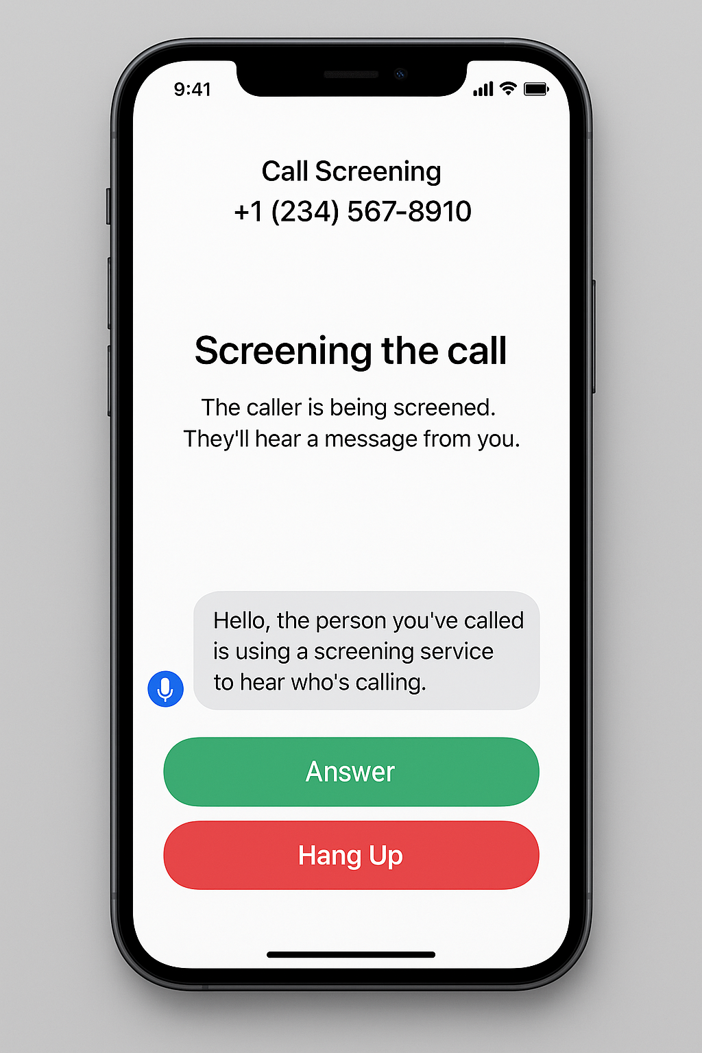 कॉल स्क्रीनिंग एक ऐसी प्रक्रिया है जिसमे फोन कॉल का जवाब देने से पहले उसकी जांच की जाती है। यह कॉल करने वाले की पहचान करने और कॉल का जवाब देने से पहले यह तय करने के लिए किया जाता है कि क्या कार्रवाई करनी है। यह एक फिल्टर की तरह काम करता है, जिससे आप कॉल उठाने से पहले कॉल करने वाले को ब्लॉक, ट्रांसफर या वॉयसमेल पर भेज सकते हैं। यह सुविधा आपको अवांछित कॉलों (Spam calls) को रोकने और महत्वपूर्ण कॉलों को प्राथमिकता देने में मदद करती है।
