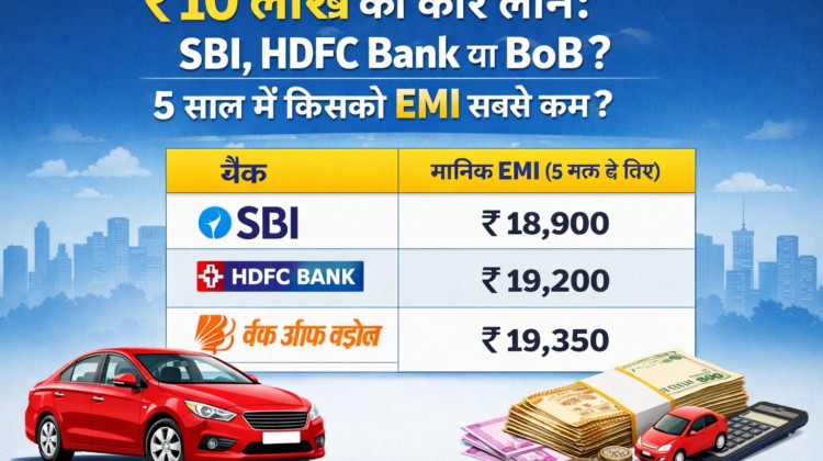 यहां हम ₹10 लाख का कार लोन (Car Loan) लेने के मामले में 3 प्रमुख बैंकों – (SBI),HDFC Bank और (BoB) – के ब्याज दरों, EMI और फायदे-नुकसान की जानकारी 800 शब्दों में सरल, आकर्षक और उपयोगी तरीके से प्रस्तुत कर रहा हूँ। इससे आपको यह समझने में मदद मिलेगी कि 5 साल के टर्म पर किस बैंक की EMI सबसे कम आएगी और कौन सा विकल्प आपके लिए सबसे अच्छा है।