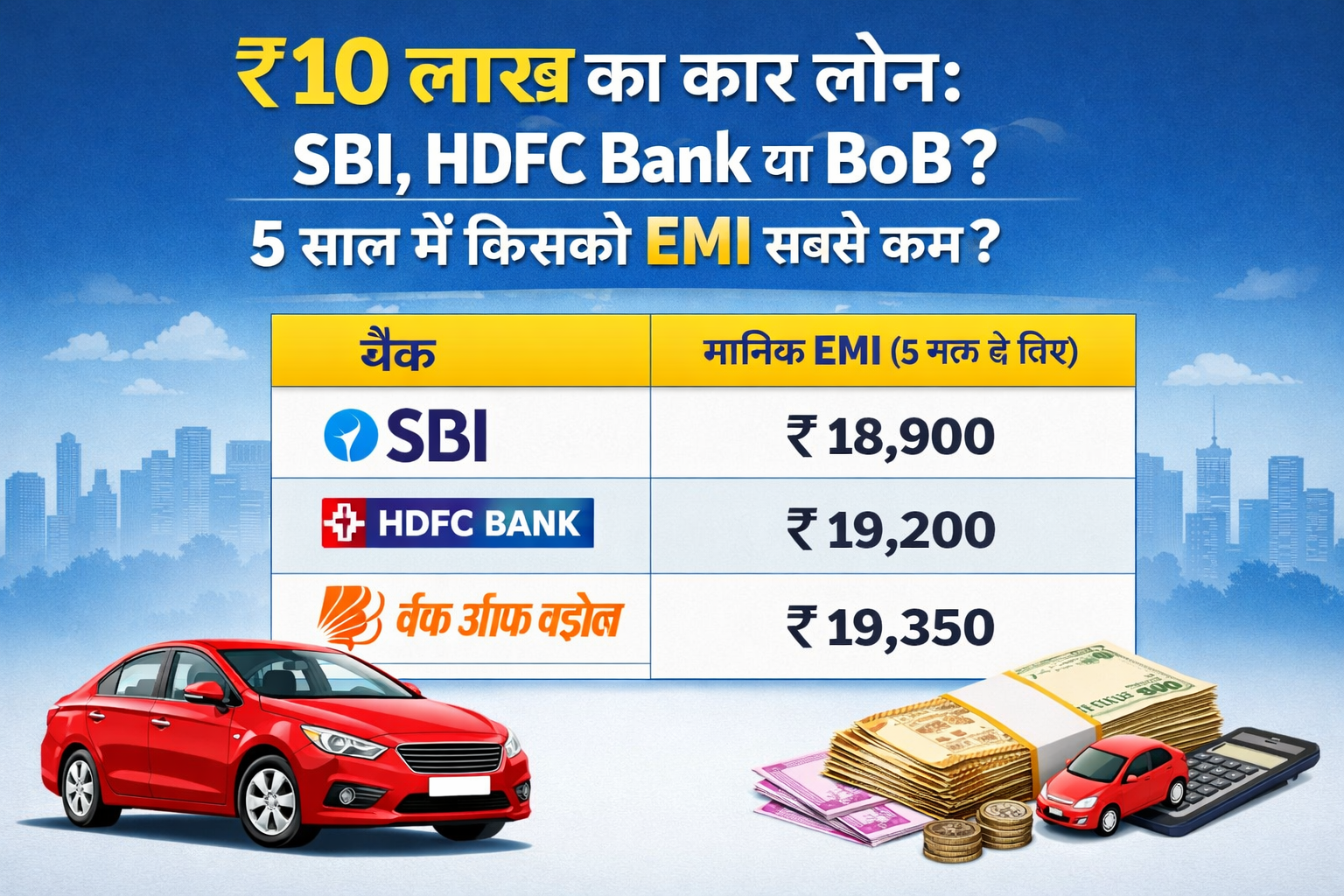यहां हम ₹10 लाख का कार लोन (Car Loan) लेने के मामले में 3 प्रमुख बैंकों – (SBI),HDFC Bank और (BoB) – के ब्याज दरों, EMI और फायदे-नुकसान की जानकारी 800 शब्दों में सरल, आकर्षक और उपयोगी तरीके से प्रस्तुत कर रहा