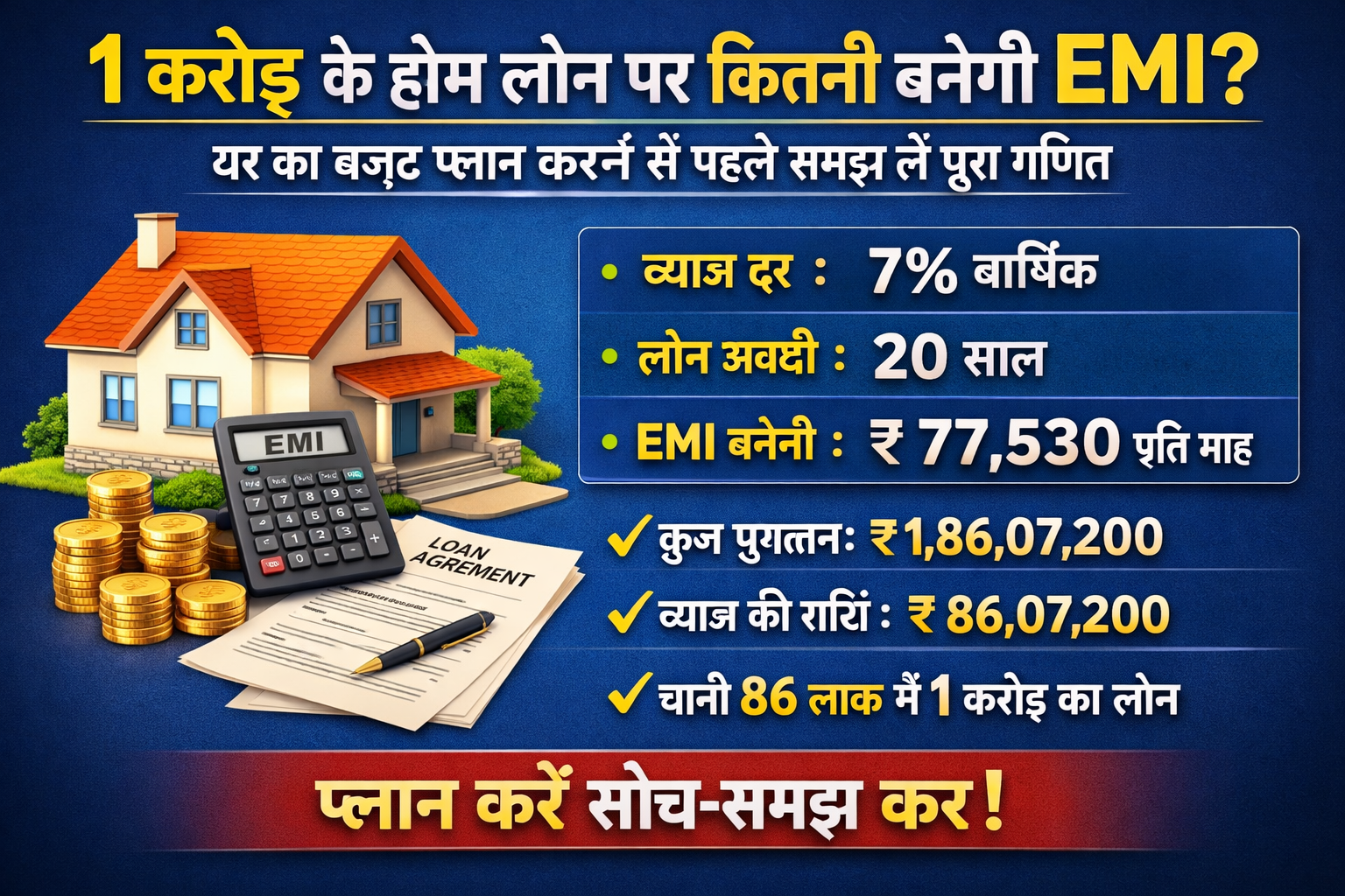 अगर आप ₹1 करोड़ का होम लोन लेने की योजना बना रहे हैं, तो सबसे बड़ा सवाल यही होता है – हर महीने कितनी EMI देनी होगी? घर खरीदना जिंदगी का बड़ा फैसला है, और बिना