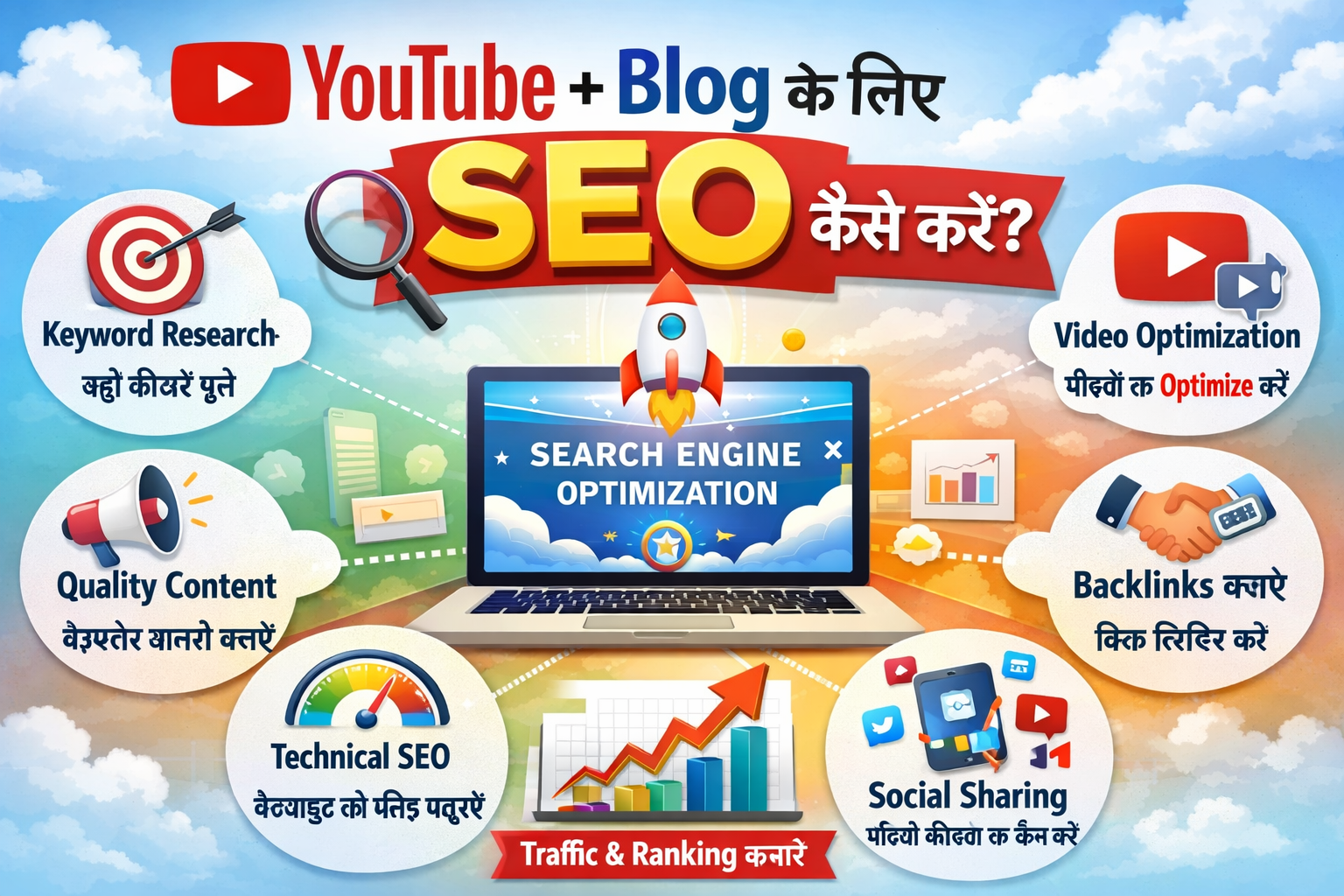 आज के डिजिटल दौर में अगर आप YouTube चैनल और ब्लॉग वेबसाइट दोनों चला रहे हैं, तो सही SEO (Search Engine Optimization) करना बेहद जरूरी है। बिना SEO के आपका कंटेंट लाखों वीडियो और आर्टिकल्स के बीच दब