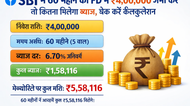 अगर आप SBI में ₹4,00,000 की FD 60 महीने के लिए करते हैं, तो आपको लगभग ₹1.5 लाख तक का ब्याज मिल सकता है और मैच्योरिटी पर आपकी राशि ₹5.5 लाख से ज्यादा हो सकती है। सीनियर सिटीज़न के लिए यह रिटर्न और भी बेहतर हो जाता है।
